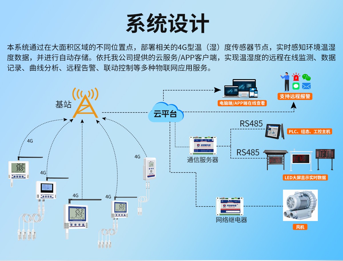 产品特点:4G无线温湿度组网监测系统以4G温湿度传感器为监测终端,实时监测环境温湿度数据,以4G网络基站为信号传输媒介,插上SIM卡就能正常使用,依托我司免费提供的云服务、APP客户端,实现温湿度的远程在线监测、数据记录、曲线分析、远程告警、联动控制等多种物联网应用服务。