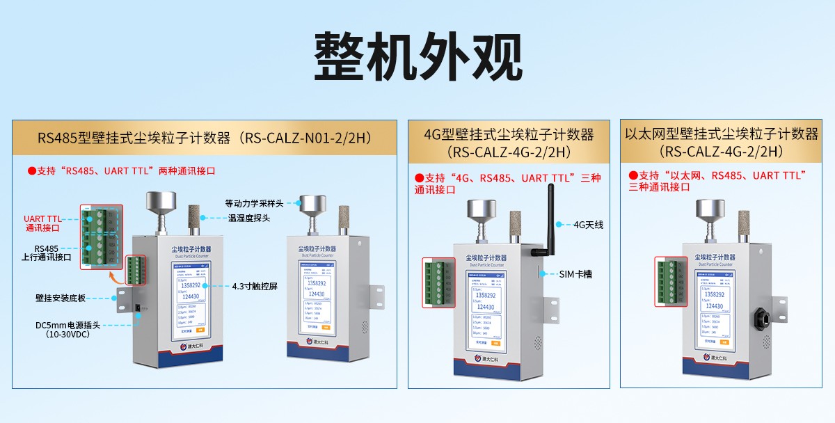 供电 DC10-30V 通讯接口 RS485 和 UART TTL 串口两种输出;可选配4G、以太网 配置方式 屏幕配置、蓝牙配置、配置软件 上传平台 4G选型默认上传环境云 数据上传间隔(4G、ETH选型) 20s(可修改,仅处于工作时间时进行数据上传) 工作环境 温度-20-60℃,湿度 0~95% 无结露(-2选型) 温度-20-50℃,湿度 0~95% 无结露(-2H选型) 粒子粒径分档 0.3µm,0.5µm,1µm,2.5µm,5µm,10µm 颗粒物计数效率 50%@0.3µm 98%@≥0.5µm 数据单位 PCS/立方米(默认)、PCS/28.3L 计数模式 累计数、差分计数 洁净度等级判定标准 ISO14644-1 GMP(静态/动态) 采集模式 周期采集(推荐使用此模式)、持续采集(不建议使用此模式,采集时间过长会导致损耗气泵寿命) 气泵使用寿命 500h 【产品选型】