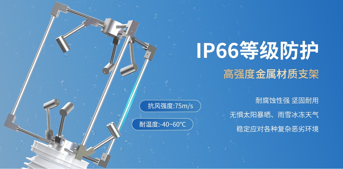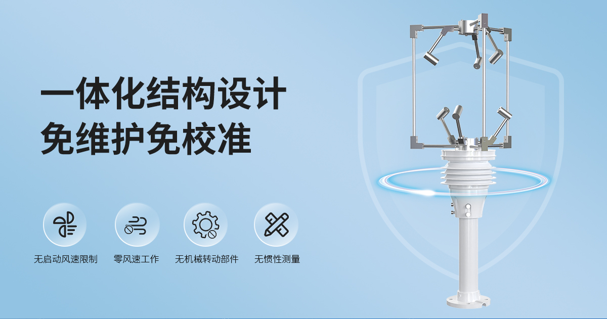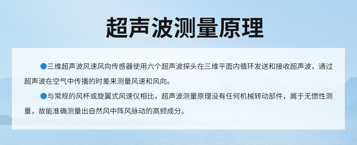 产品特点:三维超声波风速风向传感器使用六个超声波探头在三维平面内循环发送和接收超声波,通过超声波在空气中传播的时差来测量风速和风向。可以同时测量风速,风向,声速和声温的瞬时数值。