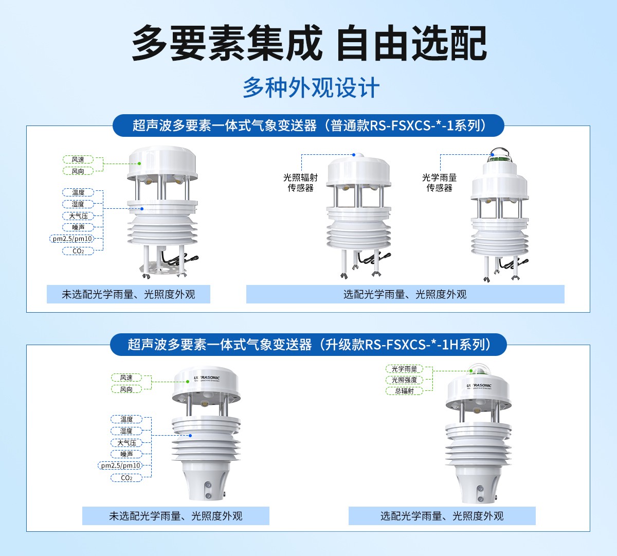 RS- 公司代号 FSXCS- 超声波一体式气象站 N01- 485接口输出 4G- 4G方式上传 1- 壳体 1H- 高级款外观 空 无内置电子指南针 CP 内置电子指南针功能