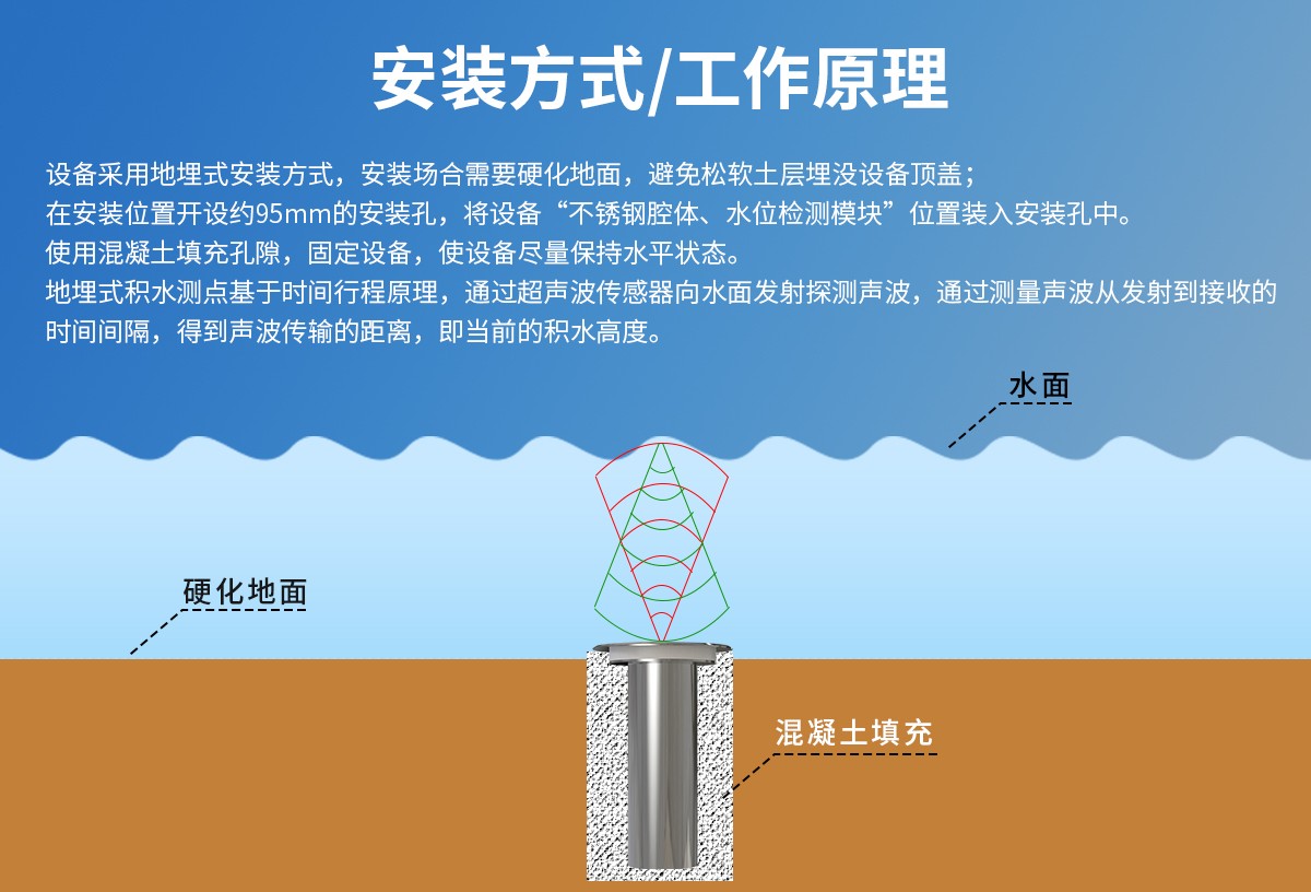 产品特点:地埋式积水测点由防水防腐 304 不锈钢外壳、水位检测模块(积水深度、积水状态)、蓝牙配置模块、NB-IoT 网络模块、内置锂亚电池等组成。地埋式积水测点通过 NB-IoT 网络上传,将测量到的水位信息传输到云平台服务器,可通过 Web 端进行查看数据,也可以通过微信小程序进行查看数据。