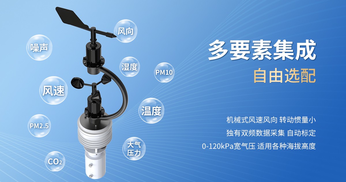 PM2.5精度:±3%FS(@0~100μg/m3、25℃、50%RH)CO2 ±(50ppm+ 3%F·S) (25℃) 量程 风速 0~70m/s 风向 8 个指示方向 湿度 0%RH~99%RH 温度 -40℃~+80℃ 大气压力 0-120kPa 噪声 30dB~120dB PM10 PM2.5 0-1000μg/m3 CO2 0-5000ppm(有效量程:400-5000ppm) 长期稳定性 温度 ≤0.1℃/y 湿度 ≤1%/y 大气压力 -0.1kPa/y 噪声 ≤3dB/y PM10 PM2.5 ≤1%/y CO2 ≤1%/y 响应时间 风速 ≤3.5s 风向 ≤3.5s 温度 ≤25s(1m/s风速) 湿度 ≤8s(1m/s风速) 大气压力 ≤2s 噪声 ≤3s PM10 PM2.5 ≤90s CO2 90%阶跃变化时一般小于180s 输出信号 RS485输出 RS485(标准ModBus通讯协议) 【产品选型】