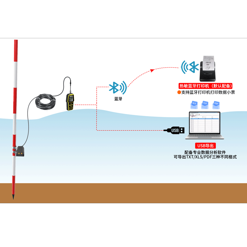 整套设备由手持式速测记录仪主机、RS485多普勒流速仪从机、手提箱、探测杆、蓝牙打印机组成。采用485通讯“一问一答”的组网方式,集数据观测、记录、分析为一体。
