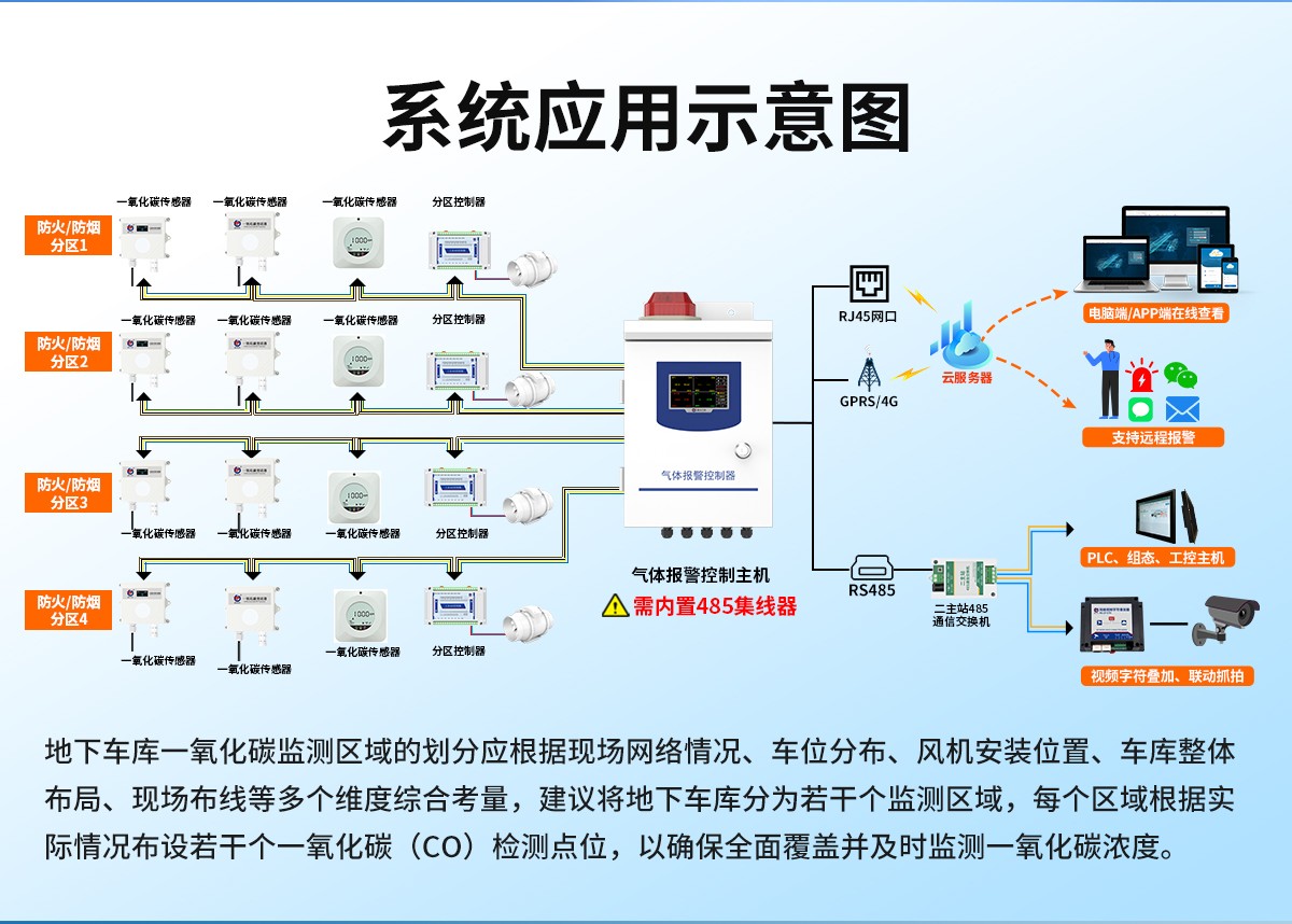 产品特点:本系统由“RS485型一氧化碳(CO) 变送器、分区控制器、气体报警控制主机、字符叠加器、摄像头”等相关部件组成,基于RS485、以太网、4G等物联网通信技术,实现了车库内不同区域的“一氧化碳集中在线监控、风机启停控制管理”,在保障监控场所安全运行的同时,也满足了智能远程运维的可靠管控要求。