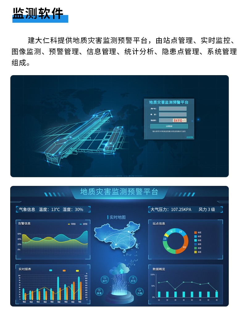 产品特点:该系统方案能因地制宜,集成深部位移监测、滑体地下水渗压监测、滑坡后缘拉张裂缝位移监测、雨量监测、地表水位监测、应力监测、地表水入渗监测等多种监测设备,实现地质灾害动态监测信息的科学化、信息化、标准化及可视化,为防灾减灾决策提供科学依据以及提高地质灾害预警预报能力和应急救灾快速反应能力。