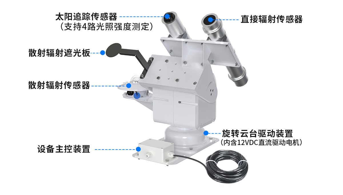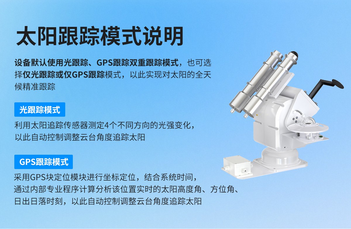 产品特点:全自动太阳跟踪辐射变送器是一款全自动无人值守自动跟踪太阳进而测量多个太阳辐射参数的设备。设备采用太阳跟踪(光追踪)与GPS跟踪双重模式,可以自动计算太阳高度角与方位角、日出日落时间并计算分析比较太阳光强变化,进而精确的全天候跟踪太阳。