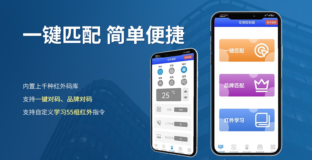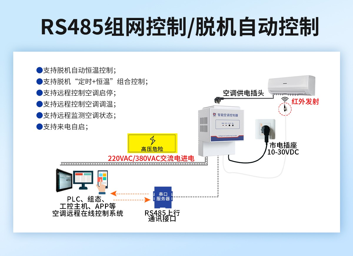 产品特点:智能空调控制器是一款同时具备红外码库及红外学习功能的空调控制器。内置空调品牌近千种红外码库,设备支持一键配码及手动选择品牌,手机 APP 配置操作简单;设备自带一路 485 接口,对于支持此协议的 PLC、单片机控制系统、力控、组态王、昆仑通态等组态软件均可实现远程控制。