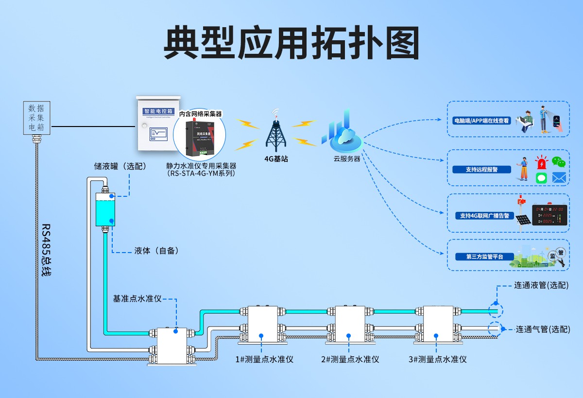 产品特点:压差式静力水准仪是一种高精密液位测量仪器,基于连通器原理通过测量各测点相对于基准点的液位变化来反映地面沉降变化,实现远距离、自动化、连续性的监测,为工程安全监测提供可靠数据支持。