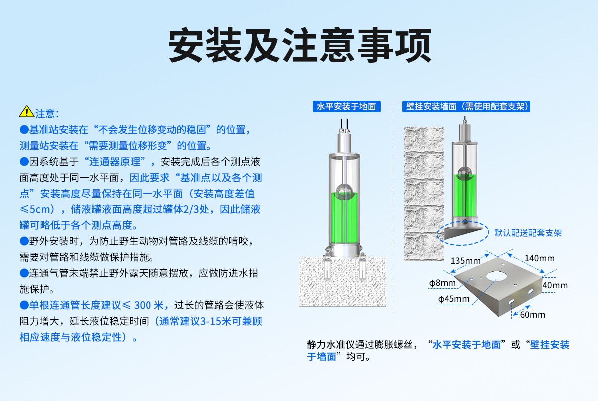 产品特点:磁致伸缩式静力水准仪采用磁致伸缩原理,可直接、精准测定当前液位值、液位变化值。基于连通器原理,通过测量“在连通管中的多个点位相对于基准点的液位变化”来监测沉降,具有高精度、高灵敏度的典型特征,能够实时、准确地反映结构物的微小变形。
