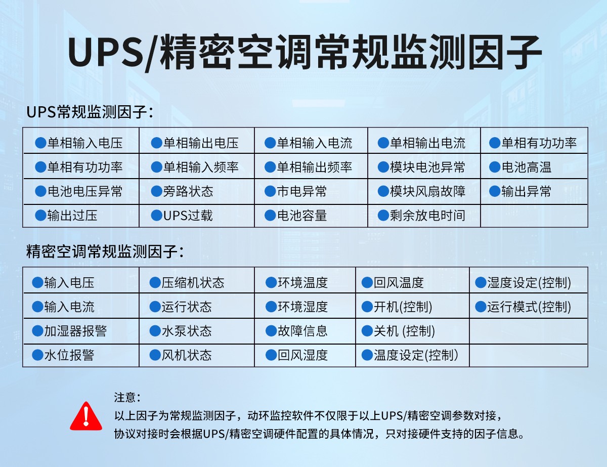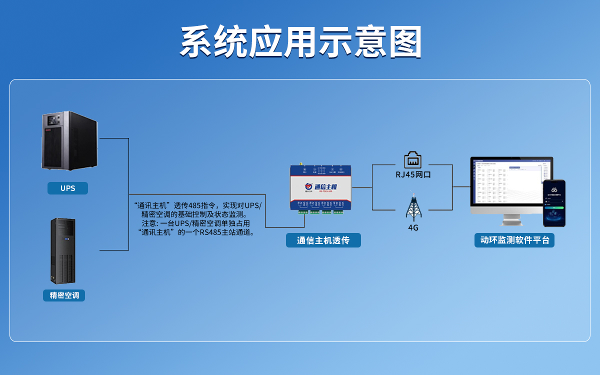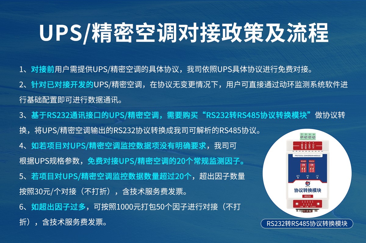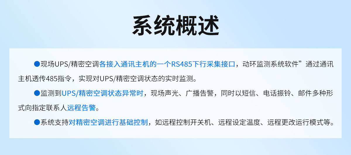 产品特点:现场UPS接入我司通讯主机的一个RS485下行采集接口,动环监测系统软件通过“通讯主机”透传485指令,实现对UPS状态的实时监测。系统可实现UPS状态异常时,现场声光、广播告警,同时以短信、电话振铃、邮件多种形式向指定联系人远程告警。