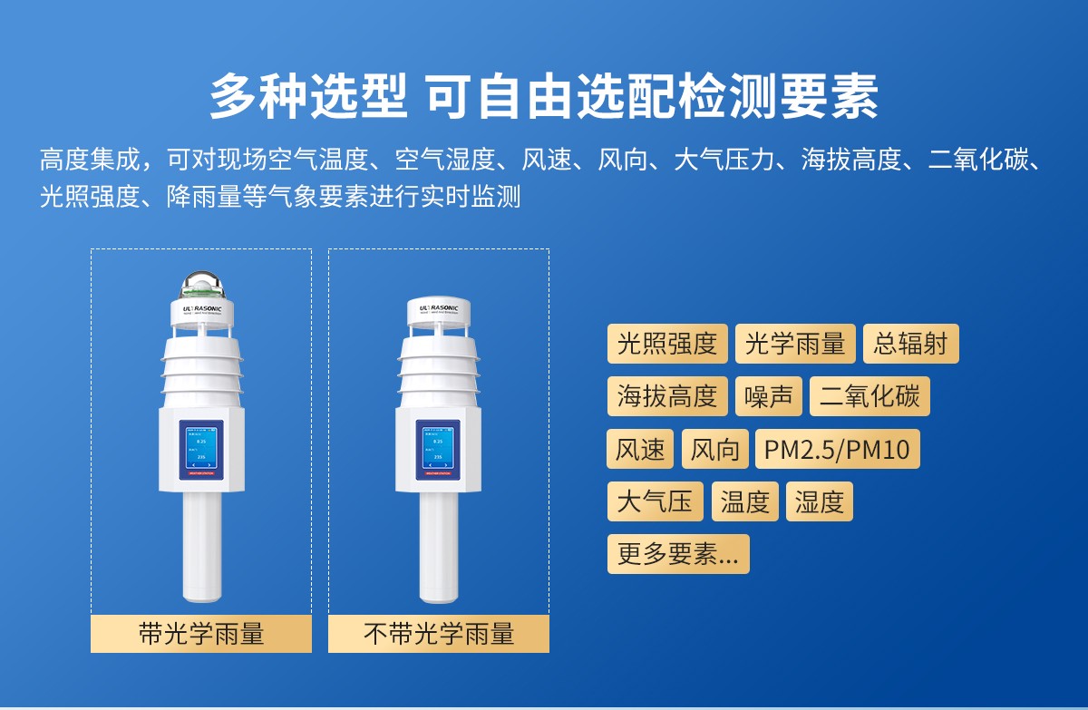 PM2.5精度:±3%FS(@100μg/m3、25℃、50%RH)CO2 ±(50ppm+ 3%F·S) (25℃) 光照强度 ±7%(25℃) 太阳总辐射 ≤±3%@150W/m² 量程 风速 0~40m/s,启动风速为0.5m/s 风向 0~359° 湿度 0%RH~99%RH 温度 -40℃~+80℃ 大气压力 0-120kPa 噪声 30dB~120dB PM10 PM2.5 0-1000μg/m3 CO2 0-5000ppm(有效量程:400-5000ppm) 光照强度 0~20万Lux 太阳总辐射 0~1800W/m² 长期稳定性 温度 ≤0.1℃/y 湿度 ≤1%/y 大气压力 -0.1kPa/y 噪声 ≤3dB/y PM10 PM2.5 ≤1%/y CO2 ≤1%/y 光照强度 ≤5%/y 太阳总辐射 ≤±3% 温湿度响应时间 温度 ≤25s(1m/s风速) 湿度 ≤8s(1m/s风速) 响应时间 风速 ≤3.5s 风向 ≤3.5s 大气压力 ≤2s 噪声 ≤3s PM10 PM2.5 ≤90s CO2 90%阶跃变化时一般小于180s 光照强度 ≤3s 太阳总辐射 ≤10s 光学雨量参数 典型精度 ±5%(来自于仁科实验室数据) 分辨率 标准 0.1mm 最大瞬时雨量 24mm/min 感雨直径 6cm 【产品选型】