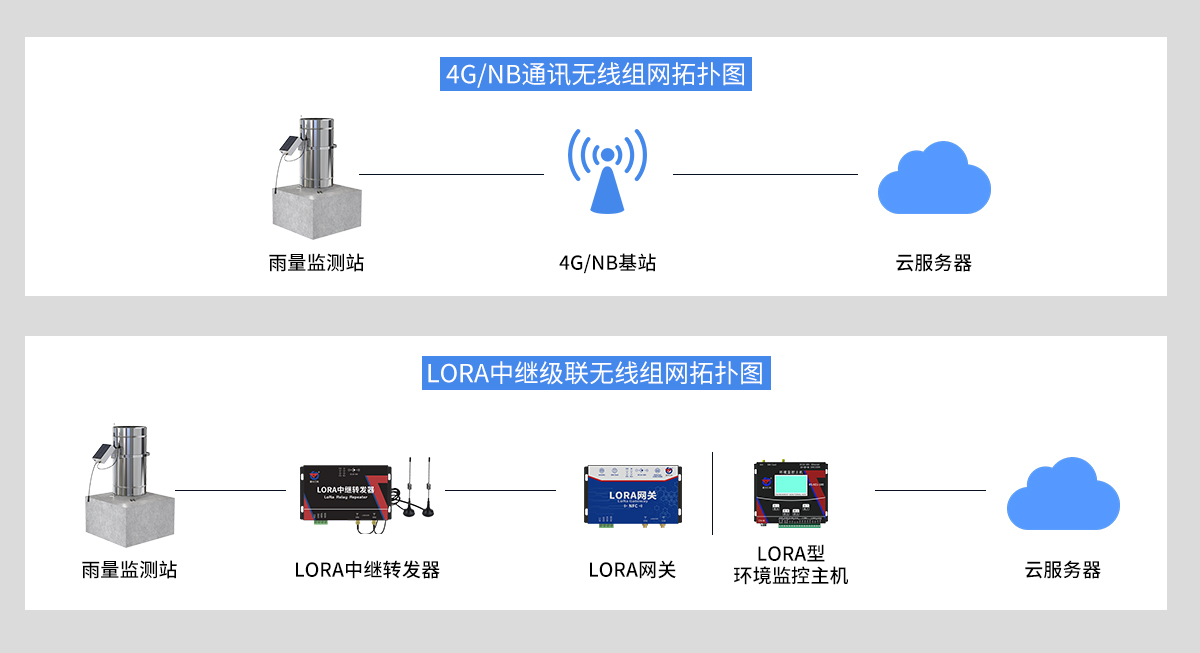 通信方式 LoRa/4G/NB(三选一) LoRa通信距离 视距3000m 供电 内置5000mAh可充电锂电池,自带太阳能板充电 续航时间 30天 续航测试条件 环境温度25℃、环境湿度45%RH,默认参数,不充电,负载(连续雨量监测) 电池充电时间 50小时(太阳能板保持满功率输出) 设备元件耐温及湿度 -20℃~+60℃,0%RH~95%RH (非结露) 设备配置 蓝牙配置,提供中性配置软件 【产品选型】