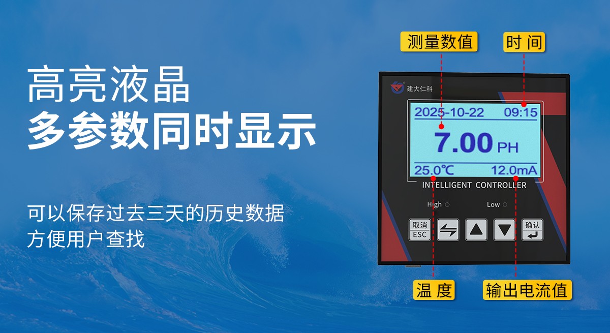 产品特点:水质485智能控制器可用来连接我公司溶解氧,浊度,COD,余氯,PH,电导率,氨氮,悬浮物,叶绿素,蓝绿藻,ORP,四电极电导率和离子类水质设备,可直观显示传感器测量数值,同时输出485信号和模拟量信号;屏幕背光时间可随意调整;带有蜂鸣器报警,可设置开启或关闭;带有两路无源继电器,可进行简单的自动控制。