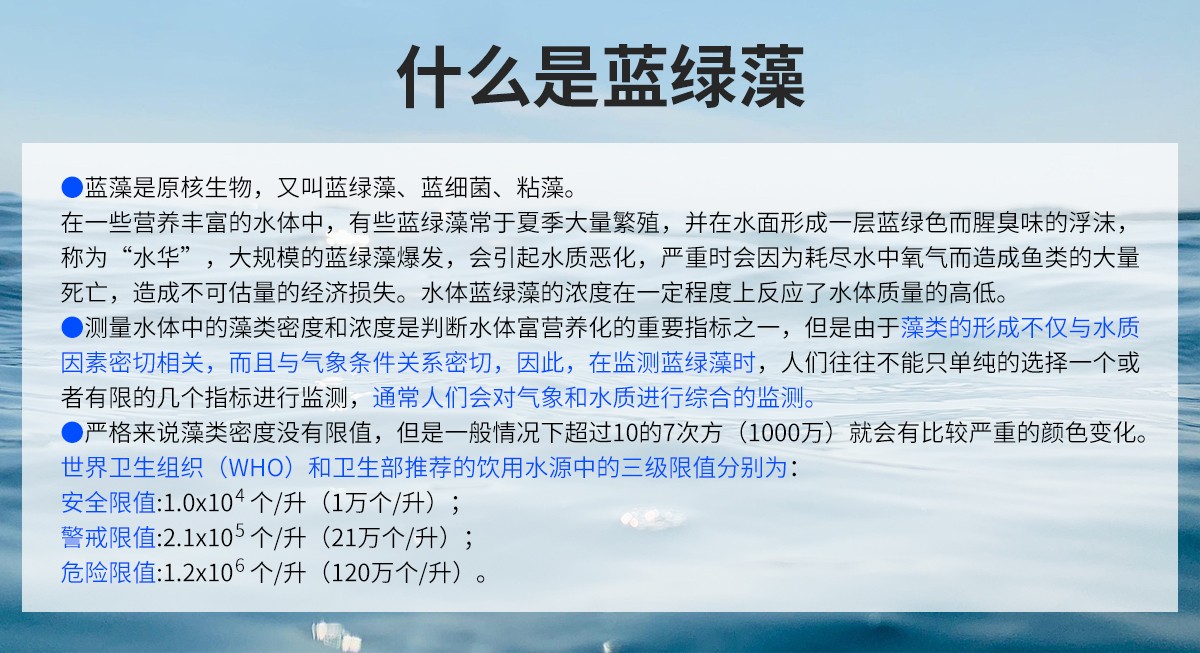 应用范围:适用于湖泊、海洋、水库、饮用水源地、地下水、水产养殖、农业用水、工厂废水、公园/景区环境保护等领域。