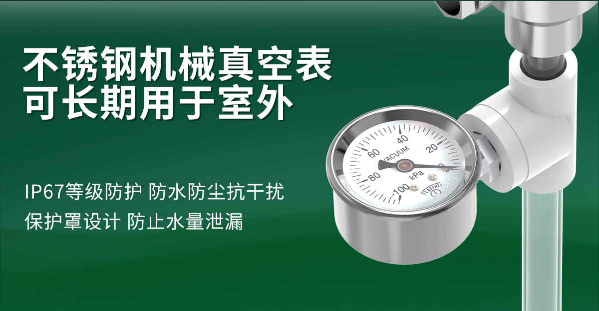产品特点:土壤张力变送器外壳采用透明 PVC 塑料管,可直观观测水位,响应速度快,有效感知土壤环境。采用不锈钢材质机械真空表,可长时间用于室外。优质陶土头,透水快不透气,灵敏度高。不受土壤中盐离子的影响,化肥、农药、灌溉等农业活动不会影响测量结果,数据精准。