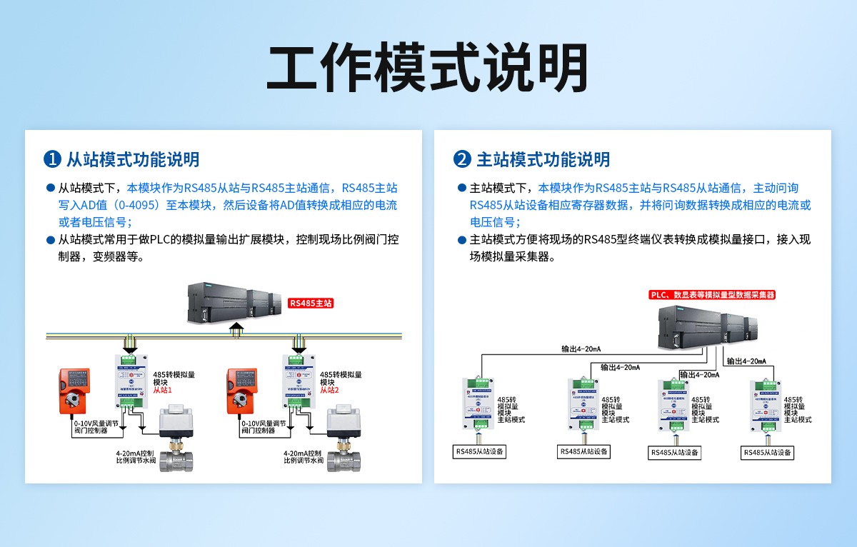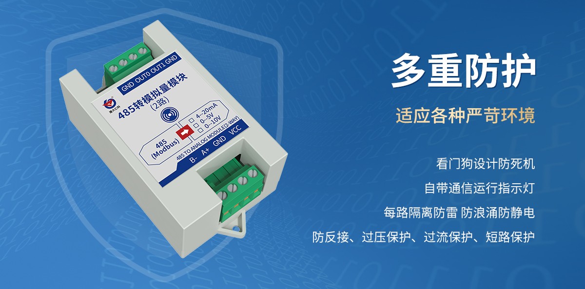产品特点:此产品是一款工业级标准模拟量输出产品,支持 0~20mA、0-5V、0-10V 的量程2通道或4通道输出。应用层采用标准 ModBus-RTU 协议,符合工业标准,适用于各种工业场合及自动化系统。方便与上位机通讯,可实现快速组网,构建监测系统。适用于各种工业场合及自动化系统。