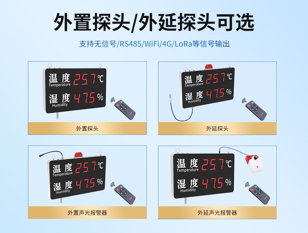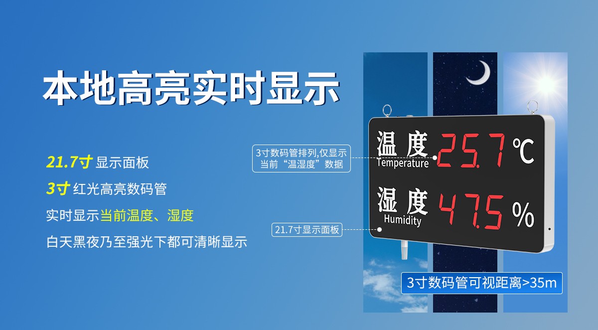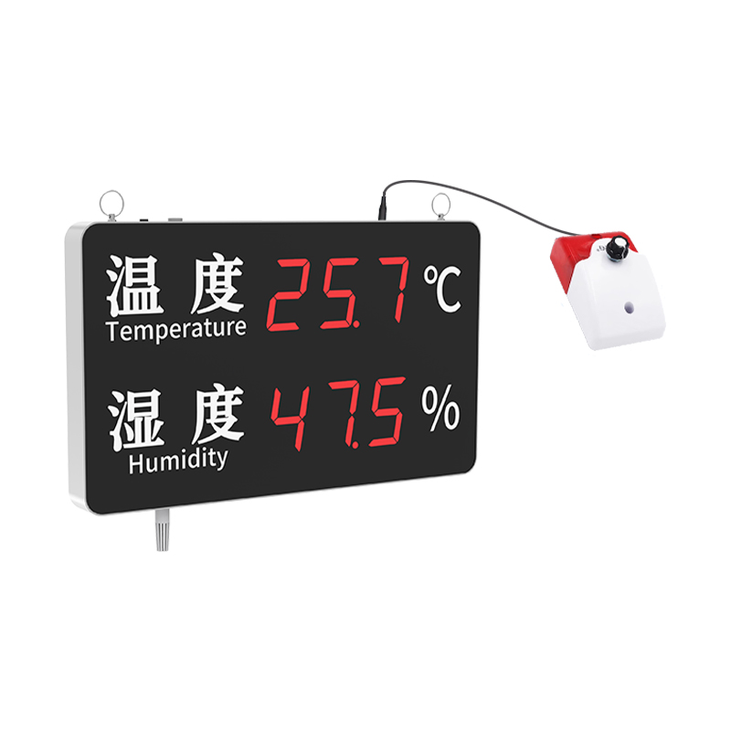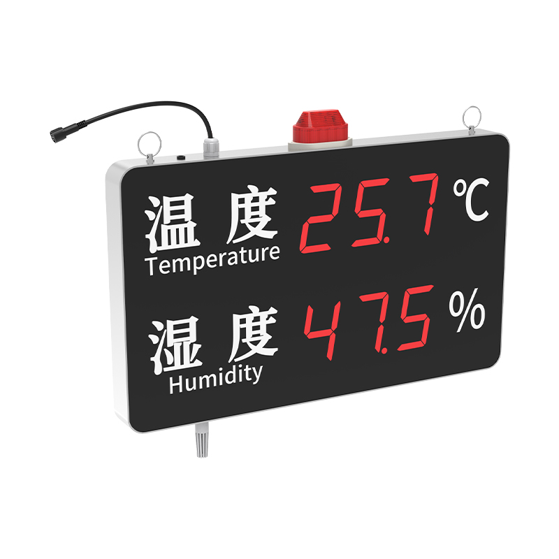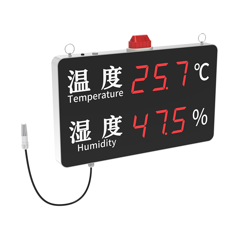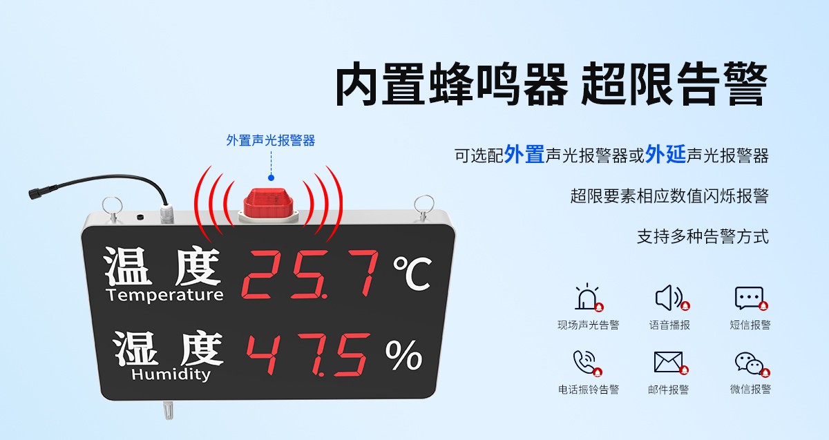 产品特点:第二代温湿度看板采用21.7寸的面板,1.5寸/3寸红光高亮数码管,可实时显示温度、湿度、万年历时间、时间信息。一体化铝合金边框,高品质亚克力面板。可选配外置声光报警器或外延声光报警器,超限要素相应数值闪烁报警。