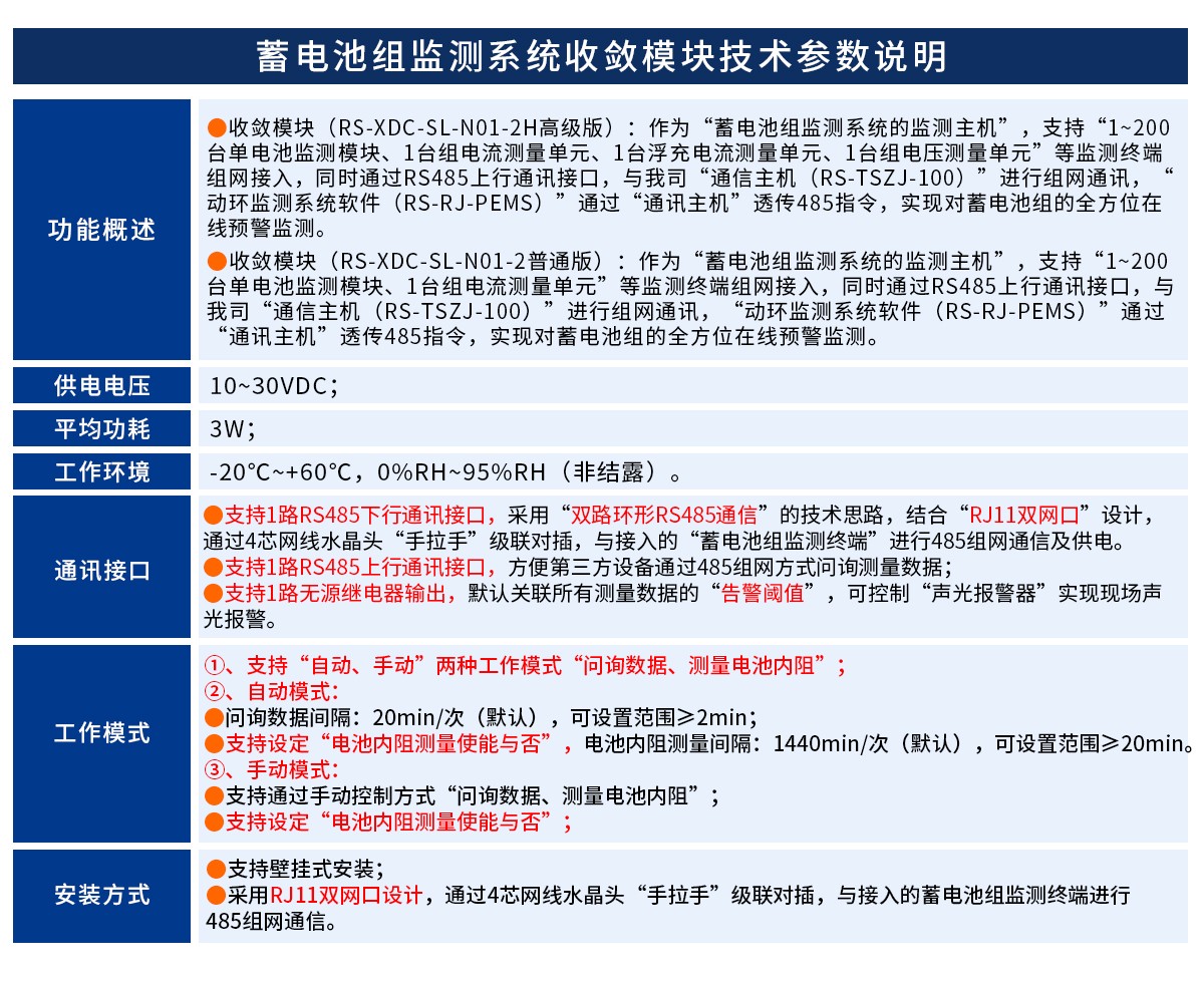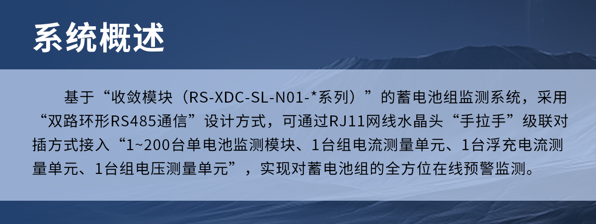 产品特点:基于“收敛模块”的蓄电池组监测系统,采用“双路环形RS485通信”设计方式,可通过RJ11网线水晶头“手拉手”级联对插方式接入“1~200台单电池监测模块、1台组电流测量单元、1台浮充电流测量单元、1台组电压测量单元”,实现对蓄电池组的全方位在线预警监测。