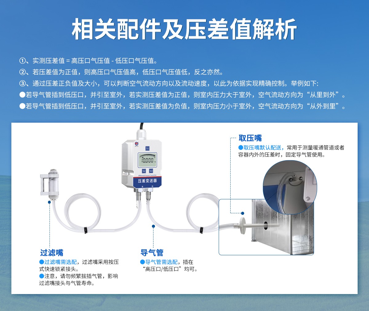 应用范围:广泛应用于医疗、洁净室、锅炉、除尘器、吸尘器、电厂、空调等环境中的压力测量。