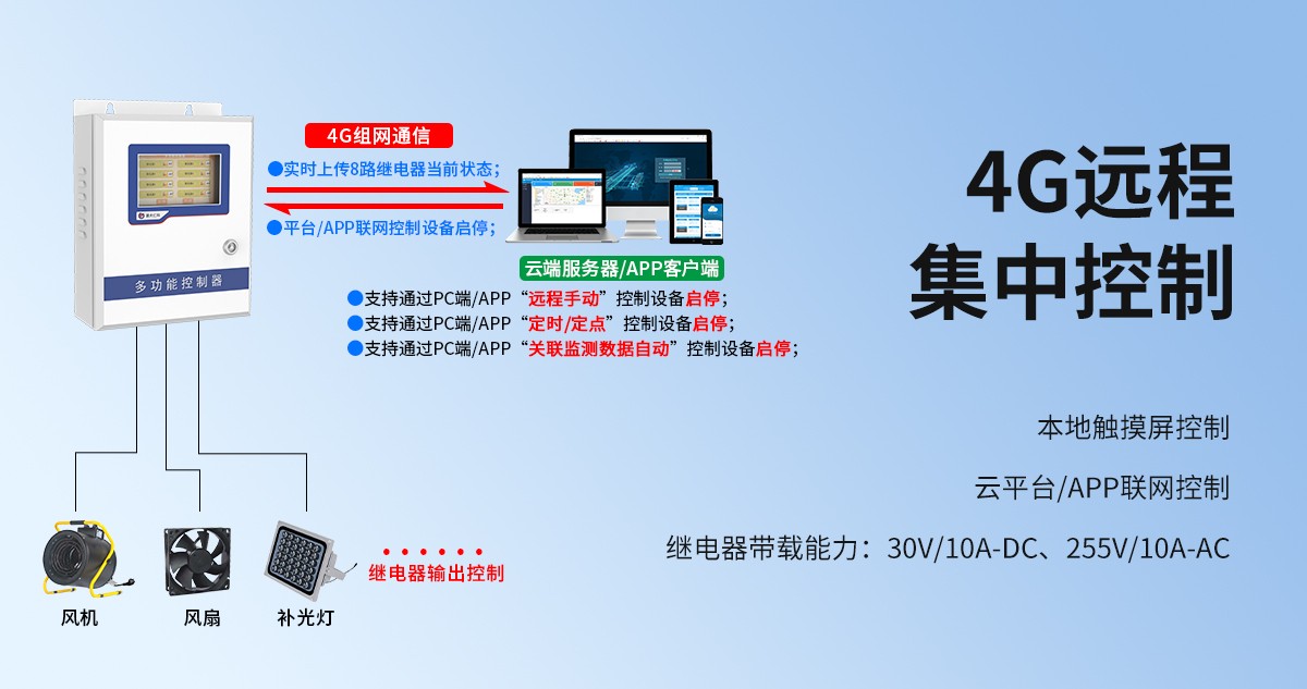 产品特点:多功能控制器是一款集成多路继电器的控制器。4G(全网通)数据上传,减少施工成本和维护成本;本地端7 寸触摸屏,多路开关量输出可用于各类场合的即时控制,可控制小于 10A-250VAC/30VDC 的设备,也可以通过我司云平台,实现远距离的继电器控制、自动、定时等工作模式的设定,实现各类设备的集中控制。