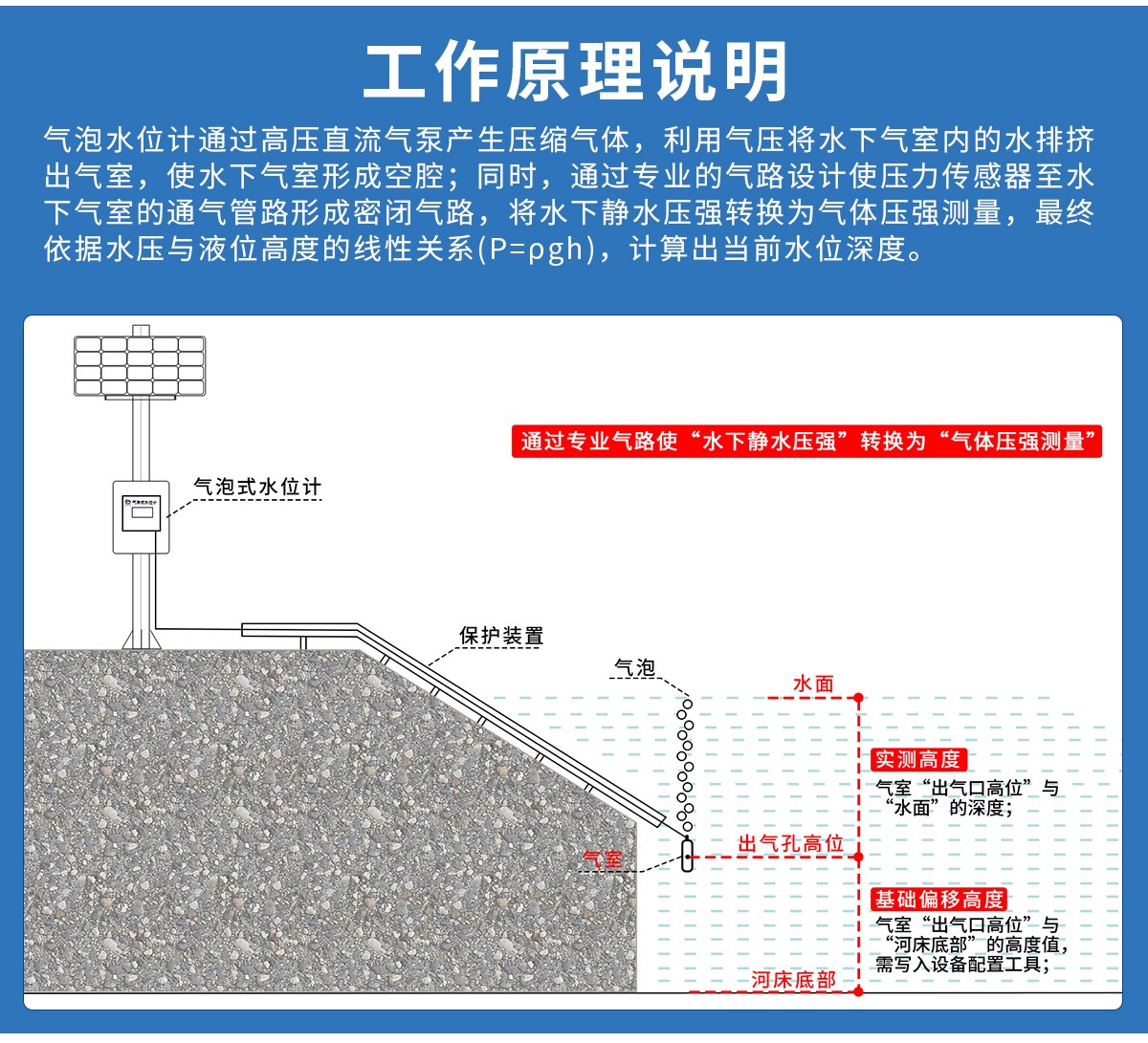 产品特点:气泡式水位计基于高精度压力传感器以及专业气动控制回路,使水下静水压强转换为气体压强测量,解决传统投入式液位计因直接接触液体而存在的易受液体冲击、易腐蚀结垢、易损坏、易受泥浆堵塞、需定期维护等问题。