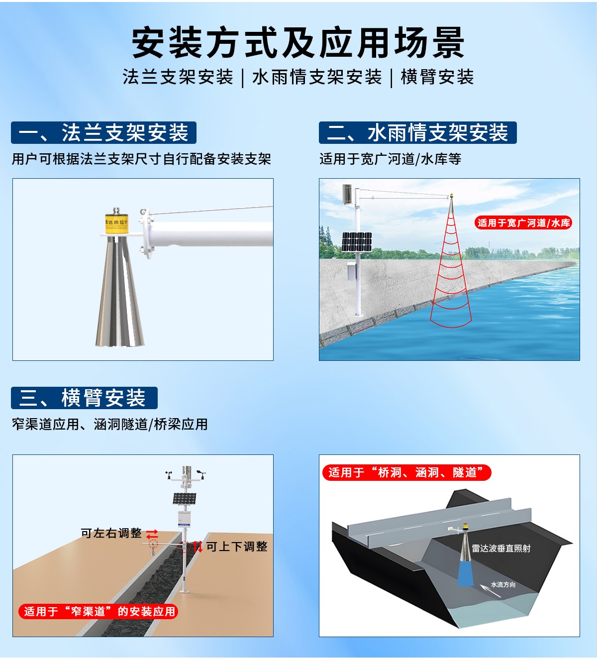 应用范围:可用于江河、湖泊、水库、水电站、灌区及输水等水利工程中进行水位的监测,及自来水、城市污水处理、城市道路积水等市政工程中水位的监测。