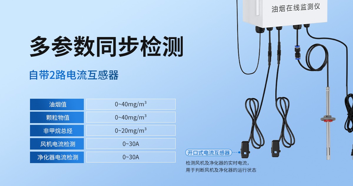 参数名称 范围或接口 说明 通信接口 4G通信 通过4G方式上传数据 油烟值 0~40mg/m³ 数值分辨率0.01mg/m3 颗粒物值 0~40mg/m3 数值分辨率0.01mg/m3 非甲烷总烃 0~20mg/m3 数值分辨率0.01mg/m3 风机电流检测 0~30A 电流检测 净化器电流检测 0~30A 电流检测 采样气体温度 -20~80℃ 被测量气体的温度 监测仪工作温度 -20~60℃ 指主机电路的工作温度 功耗 ≤23W 峰值功耗23W 供电 交流100~240V 标准供电电压交流220V 存储容量 13万条 13万条存储数据 【产品选型】