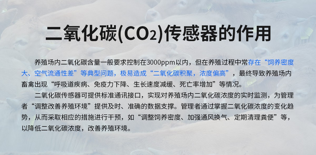 产品特点:二氧化碳传感器可提供标准通讯接口,实现对养殖场内二氧化碳浓度的实时监测,为管理者“调整改善养殖环境”提供及时、准确的数据支撑。管理者通过掌握二氧化碳浓度的变化趋势,从而采取相应的措施进行干预,如“调整饲养密度、加强通风换气、定期清理粪便”等,以降低二氧化碳浓度,改善养殖环境。