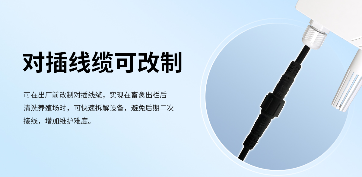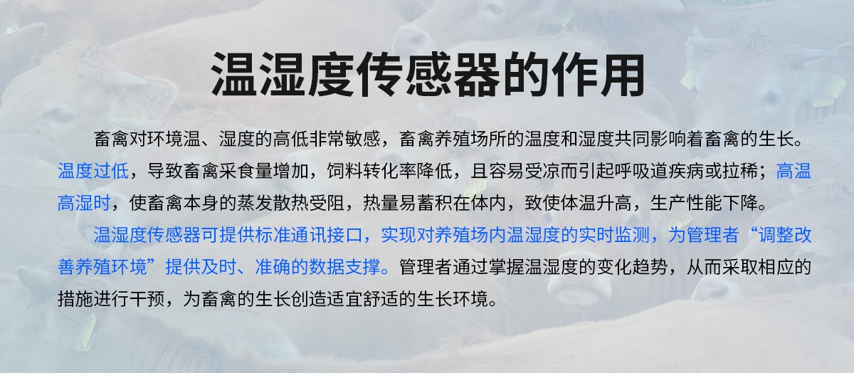 产品特点:温湿度传感器可提供标准通讯接口,实现对养殖场内温湿度的实时监测,为管理者“调整改善养殖环境”提供及时、准确的数据支撑。管理者通过掌握温湿度的变化趋势,从而采取相应的措施进行干预,为畜禽的生长创造适宜舒适的生长环境。