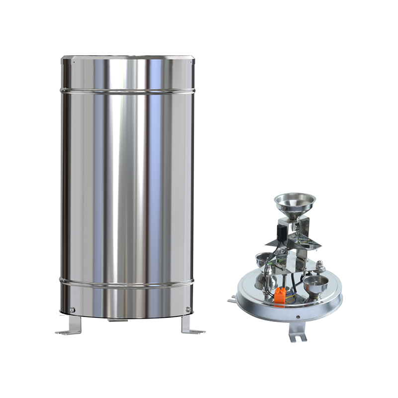 (4)将设备底部三个螺丝拧下,取不锈钢外筒,将固定翻斗的两个扎带剪断,然后将外筒装上,准备工作完成。